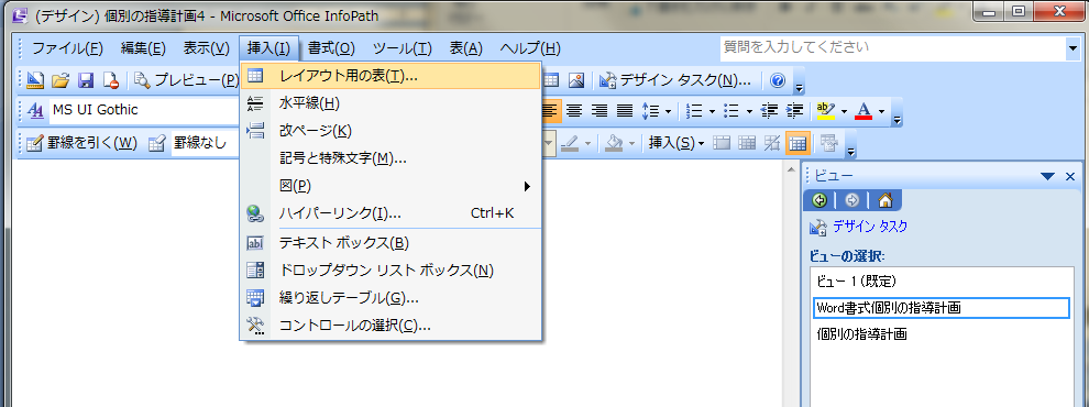 InfoPathの「Word書式個別の指導計画」ビューのレイアウト表の中に,貼り付け とすると,そのままの形で貼りつく ![]()