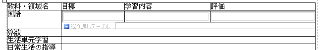 「国語T」テーブルの「目標」「学習内容」「評価」フィールドで繰り返しテーブル ![]()